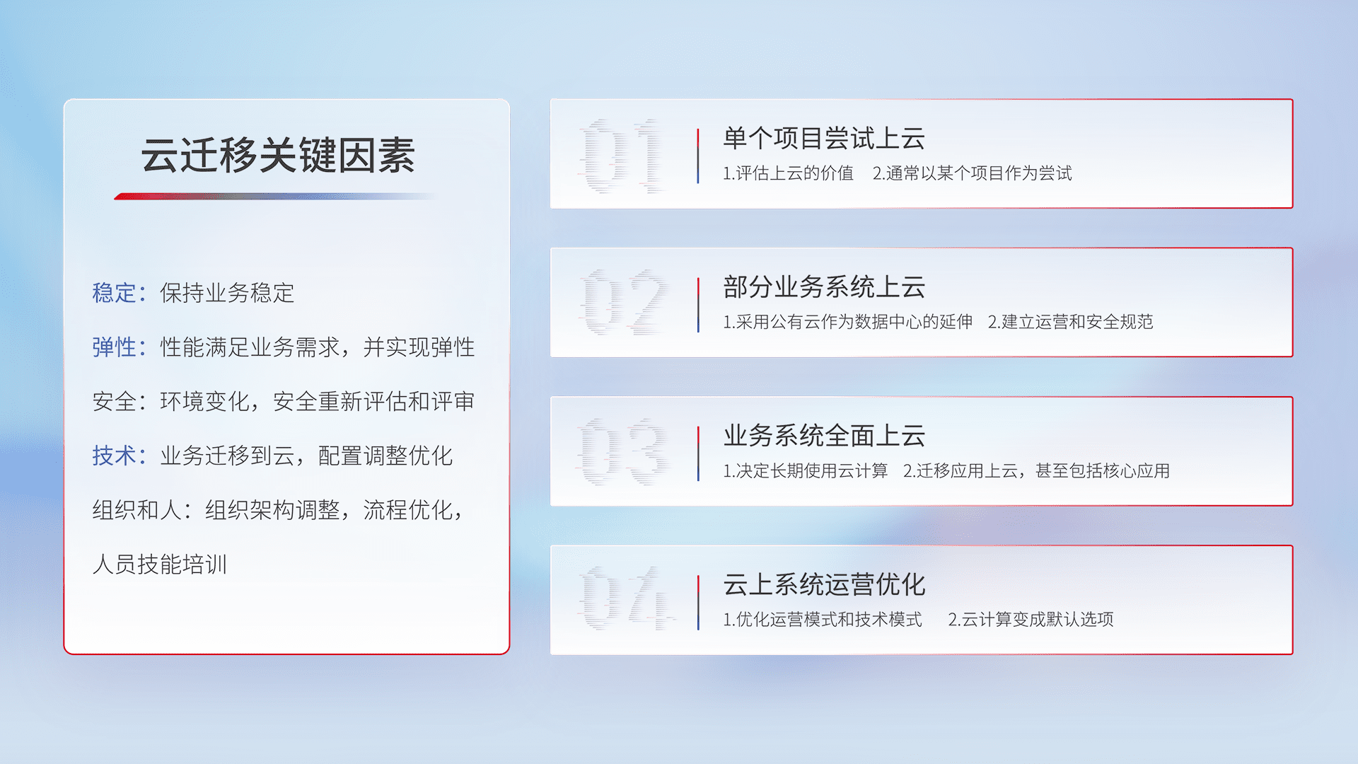 结合实际业务,,,从规划设计、、云平台选型、、、、云原生改造、、、数据迁移、、集成交付,,迁移全过程为客户识别最佳上云路径,,做好风险识别管理,,,,设计网络架构、、、身份权限、、、、安全审计合规、、、、操作审计、、、、日志审计、、监控告警策略、、、、多站点容灾设计等,,,,对云上基础设施进行整体规划,,,提升IT治理水平,,,以满足弹性、、高可用、、高性能的需求。。。。