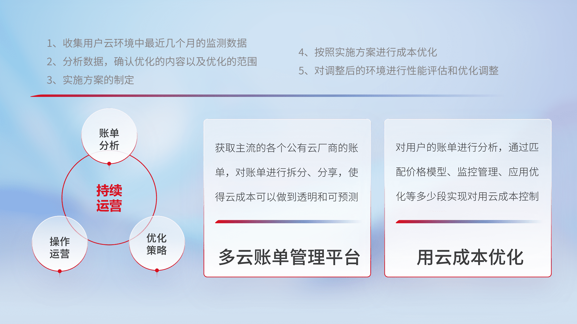 通过多云纳管,,,以统一的资源数据模型把客户的云资源进行抽象和封装,,进而实现对多云资源的统一操作,,,,保障云资源管理的可靠性、、、稳定性与可用性。。量身定制化运维内容,,,配置、、、开发运维、、补丁管理、、、备份、、监控、、、认证和访问管理、、审计和日常巡检等,,,,保障在用云过程中的可靠度,,,,稳定度以及高可用率。。